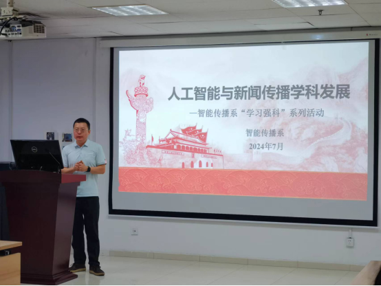 杨帆副教授以“人工智能与智能传播学科发展”为主题,以智能传播的科学问题、智能传播与智能产业、智能传播与社会治理为切入点,带领系所深入学习《习近平向2024世界智能产业博览会致贺信》。他指出,媒介技术、传播学、社会现象是智能传播学科的核心要素,我国人工智能发展以人工智能与实体经济深度融合为特征,智能传播产业发展的重点在于主流媒体的工业化、智能化转向。作为智能传播研究者,应当把握数字化、网络化、智能化发展机遇,深入挖掘智能传播的时代内涵和当代价值,推动智能传播服务于高端制造业、赋能国际传播。