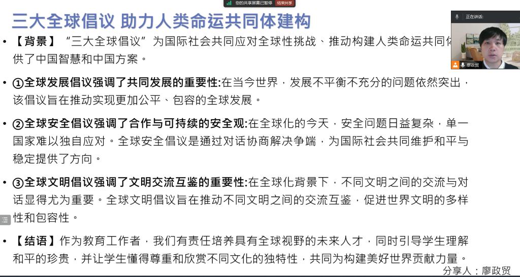 廖政贸结合刘彦领学的三大全球倡议进行了观点分享。他认为,习近平总书记提出的三大全球倡议为国际社会共同应对全球性挑战、推动构建人类命运共同体提供了中国智慧和中国方案。首先,全球发展倡议强调了共同发展的重要性。在当今世界,发展不平衡不充分的问题依然突出,该倡议旨在推动实现更加公平、包容的全球发展。其次,全球安全倡议强调了合作与可持续的安全观。在全球化的今天,安全问题日益复杂,单一国家难以独自应对。全球安全倡议是通过对话协商解决争端,为国际社会共同维护和平与稳定提供了方向。最后,全球文明倡议强调了文明交流互鉴的重要性。在全球化背景下,不同文明之间的交流与对话显得尤为重要。全球文明倡议旨在推动不同文明之间的交流互鉴,促进世界文明的多样性和包容性。总之,作为教育工作者,我们有责任培养具有全球视野的未来人才,同时引导学生理解和平的珍贵,并让学生懂得尊重和欣赏不同文化的独特性,共同为构建美好世界贡献力量。