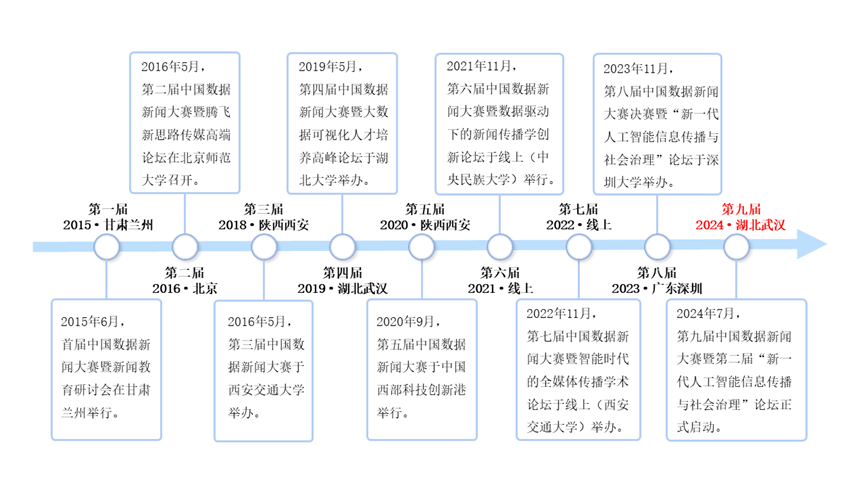 2015年6月,首届中国数据新闻大赛暨数据新闻教育研讨会在甘肃兰州举行。2016年5月,第二届中国数据新闻大赛暨腾飞新丝路传媒高端论坛在北京召开,赛事吸引了国内120余家机构报名,34.3万余人投票。2018年6月,第三届中国数据新闻大赛于陕西西安举办,共有业界学界300多个团队1500余人报名参赛,收到全球各地共计360余件作品。2019年6月,第四届中国数据新闻大赛暨大数据可视化人才培养高峰论坛于湖北武汉举办,参赛队伍共726支,网络点击量近159万人次。2020年9月,第五届中国数据新闻大赛决赛暨大数据时代的新闻教育研讨会于陕西西安的中国西部科技创新港举行,共有800余支队伍报名参赛。2021年11月,第六届中国数据新闻大赛暨数据驱动下的新闻传播学创新论坛于线上云平台举行,共计900余支队伍参赛报名。2022年11月,第七届中国数据新闻大赛暨“智能时代的全媒体传播”学术论坛成功举办,共收到1000余支队伍5000余人报名,网络投票总热度达300余万人次。2023年12月,第八届中国数据新闻大赛决赛暨“新一代人工智能信息传播与社会治理”学术论坛在深圳大学隆重举办,吸引了来自350余所海内外高校与数十家媒体的1300余支队伍参赛,报名人数高达6000余人。