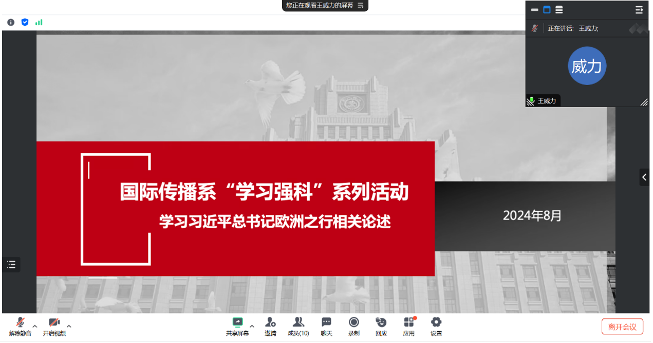 8月29日晚,国际传播系策划并在线举办第四次“学习强科”业务研讨活动。本次会议由国际传播系副教授廖政贸主持,院长汪文斌与国际传播系全体师生共同参与研讨。国际传播系副教授王威力、系主任刘婵君先后领学。