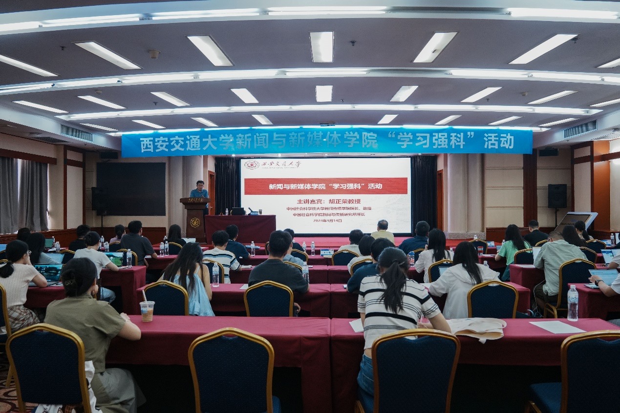 活动伊始,汪文斌院长对胡正荣教授莅临西安表示诚挚欢迎与感谢,并就 “学习强科”活动的发起背景、组织宗旨及其对本学科发展的重要意义进行了深入阐述。他表示,随着互联网的兴起与新一代信息技术的颠覆性变革,新闻传播学科的发展建设应心怀“国之大者”,立足服务国家重大战略需求,以学习习近平总书记的最新论述、最新讲话为抓手,落实党中央和习近平总书记对新闻工作、宣传思想文化工作的重要指示,抢占学科发展深度融合与智能融合新阵地、新赛道,打造具有交大“工字牌”鲜明特色的智能传播专业品牌。