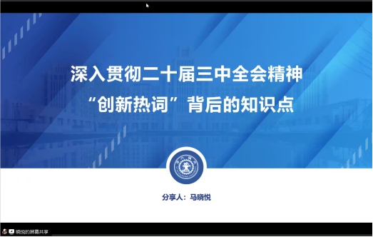 2024年9月24日上午,智能传播系在线开展第五次“学习强科”业务研讨活动。此次活动由系主任马晓悦教授担任分享人,智能传播系支部书记杨帆主持。研讨主题为《深入贯彻二十届三中全会精神“创新热词”背后的知识点》,系所全体教师及博士生共同参与研讨。