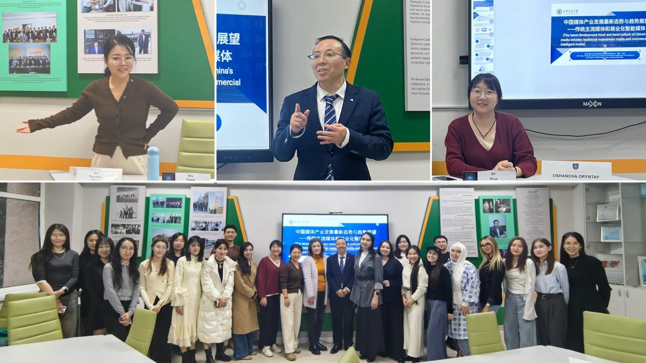 访问哈萨克斯坦国立大学期间,吴锋教授为新闻学院留学生作“中国媒体产业发展最新态势与趋势展望”学术报告,深入剖析中国媒体产业发展现状与未来趋势,引发了留学生们的浓厚兴趣。刘婵君副教授和达雅楠助理教授随后就留学生关于中国社交媒体、网络平台等媒体发展相关问题进行了耐心解答,促进了学术互动与文化交流。