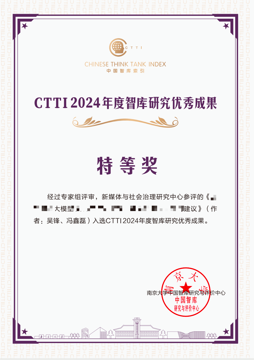 此次评选陕西高校新型智库“新媒体与社会治理研究中心”有3项成果入选,其中,2项智库决策建言成果《关于构建*******的对策建议》和《*****大模型*****》获2024CTTI智库优秀成果特等奖;《“新媒体与社会治理研究中心”平台》获2024CTTI智库建设最佳案例优秀案例。