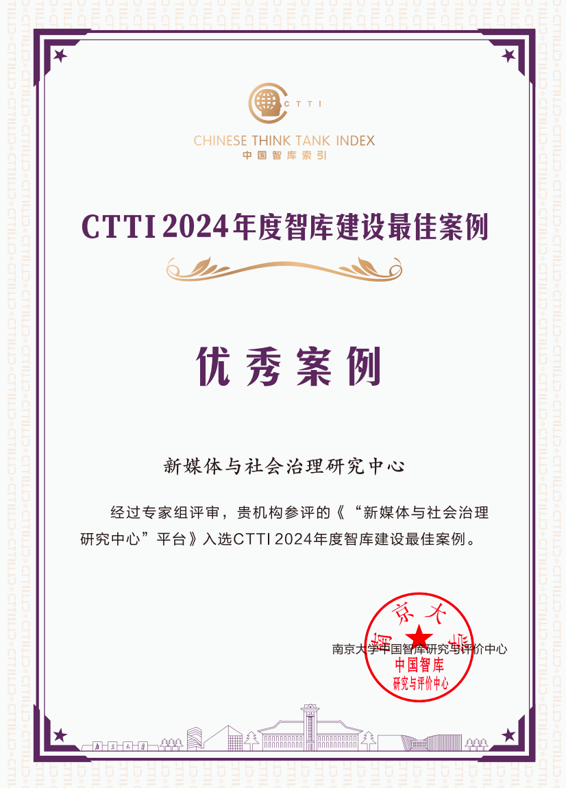 近日,由南京大学中国智库研究与评价中心与光明日报智库研究与发布中心共同创办的“新型智库治理论坛”在兰州大学召开,论坛发布了2024年度智库最佳案例与优秀成果。陕西高校新型智库(A类)“新媒体与社会治理研究中心”获2024CTTI智库建设最佳案例优秀案例,并有两项智库成果获2024CTTI智库优秀成果特等奖,创历史最好成绩。