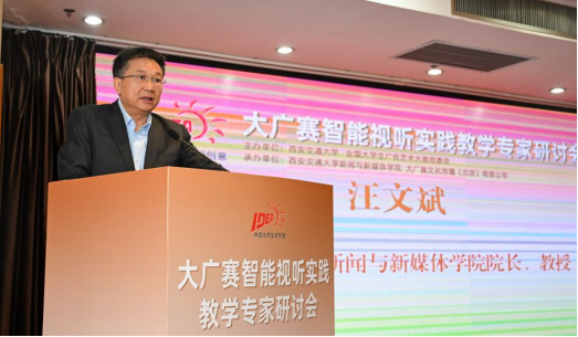 汪文斌介绍了第十七届大广赛营销创客类竞赛的承办情况,指出赛事在推动实践教学、促进产教融合方面的独特价值。他指出,学院以“打好‘工字牌’、突出交叉特色”为指导,高度重视学生实践教学工作,专门成立实践教学发展中心,着力构建课程实践、实习实训、科研训练、学科竞赛“四位一体”的实践教学体系。学院师生在第17届大广赛中斩获国赛奖项 13 项,特别是在创新赛道AIGC微短剧上获得一等奖1项、二等奖1项、三等奖1项,是学院大力推进产教融合,深化“以赛促教、以赛促学、以赛促创”教学理念的生动实践,彰显了学院“人工智能+传媒”的学科发展特色。他表示,大广赛组委会与我院共同建立的“智能视听实践教学基地”,将着力于加快推进实践教学课程体系改革,全面提升全国高等院校智能视听相关专业教师的教学实践能力,力求在选拔智能传播高端行业人才、树立智能行业行为规范的同时,为社会培养兼具人文底蕴、创新思维与社会责任的新时代传媒人才。