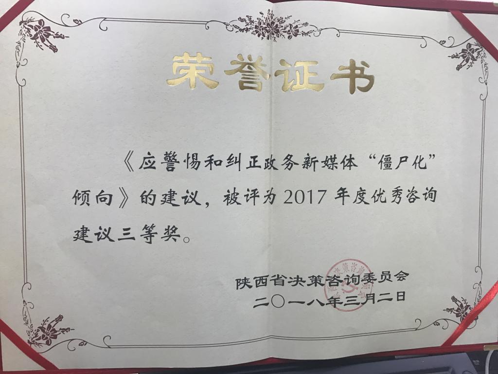 近日,我院政务新媒体研究中心陈强副教授和李明德教授提写的咨询建议《应警惕和纠正政务新媒体“僵尸化”倾向》荣获2017年度优秀决策咨询建议三等奖。这是我院政务新媒体研究中心持续关注陕西省政务新媒体建设的重大理论和现实问题,开展课题研究和战略咨询,建言献策取得的新的可喜的成绩。