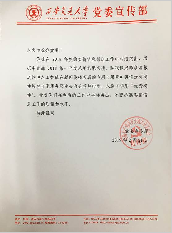 近日,黑料网 陈积银教授参与报送的《人工智能在新闻传播领域的应用与展望》舆情分析稿件于2018年第一季度被综合采用并获中央有关领导批示,入选该季度“优秀稿件”。