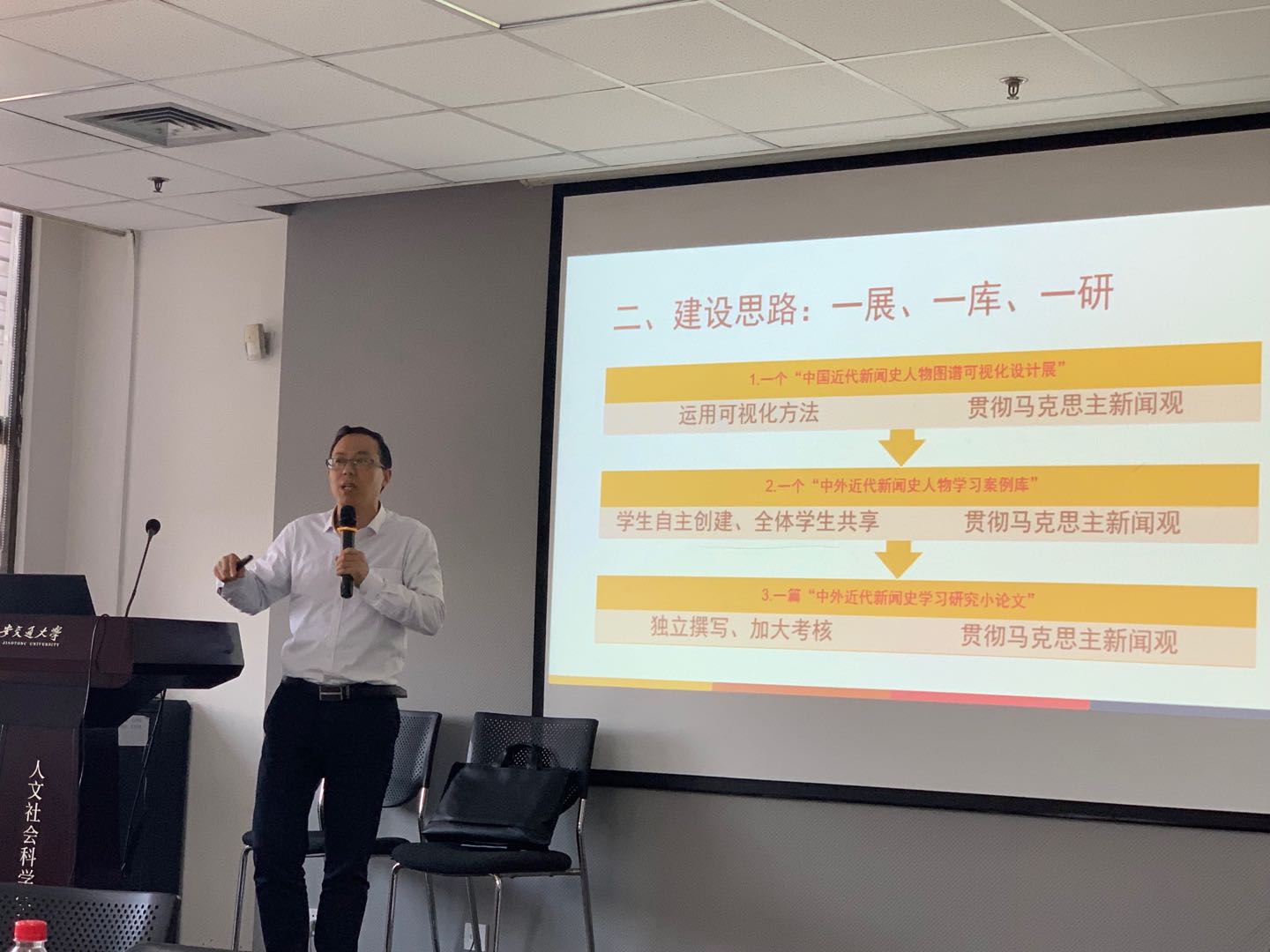 推进课程思政研讨会”在兴庆校区教学主楼E703召开,此次活动的主题为“经典案例怎么写”“课程思政建设怎样进行”。我院吴锋教授《中外新闻史》入选学校首批课程思政优秀案例,团队应邀做了课程分享,青年教师申楠、叶妮参加了讨论会。