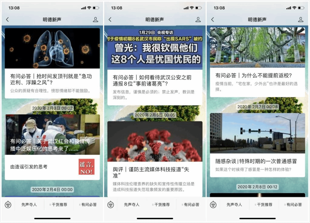 我院除了谋划疫情期间教学工作安排外,“明德新声”团队发挥专业优势,在抗击疫情期间发挥平台力量,坚守宣传阵地,辟谣引导、普及科学知识、传递能量、振奋人心,发表了十余篇有传播力、影响力和公信力的文章,众多校友阅读后表示感到了温度、力度、深度且深受鼓舞。