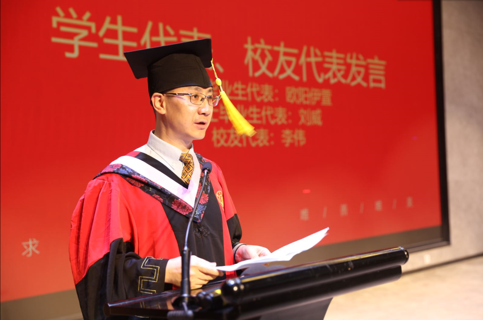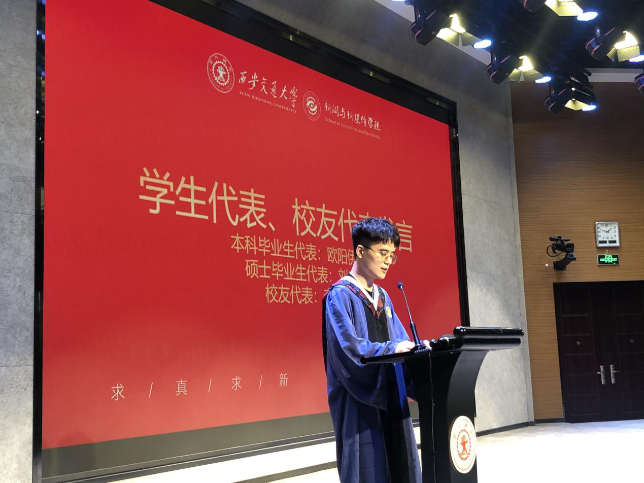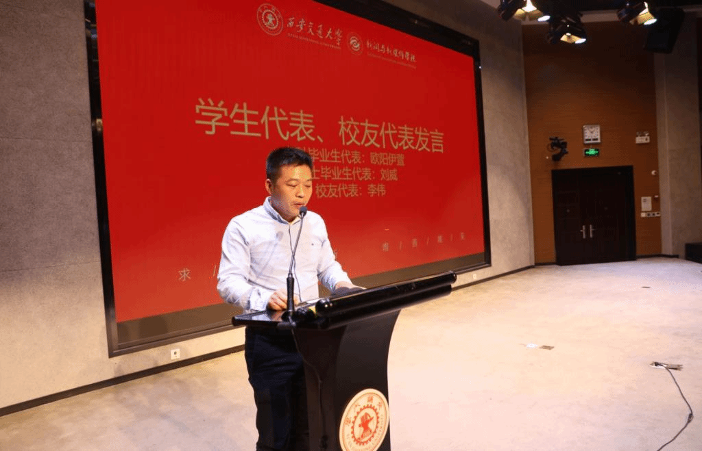 校友代表李伟以兄长情怀向毕业生讲述了自己与交大的故事。回顾了作为一名新闻人的从业经历,表示自己取得的成绩离不开恩师李明德院长,更离不开西安交大的全力培育。他勉励毕业生们不断学习,响应时代召唤,继续发出光热。
