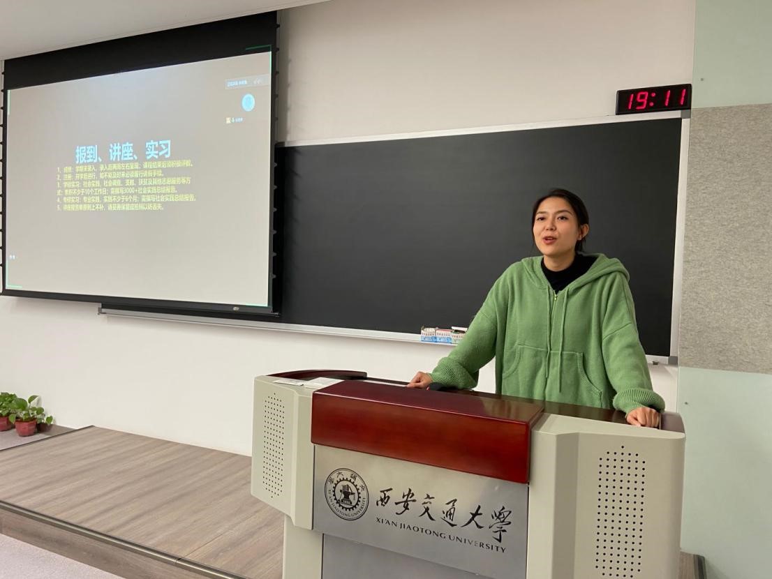 研究生教务王静茹老师围绕研究生教学相关事项进行发言。她介绍不同老师职责的分配、研究生毕业论文的重要时间节点,还对学院的请假制度、报道讲座实习情况作了说明。