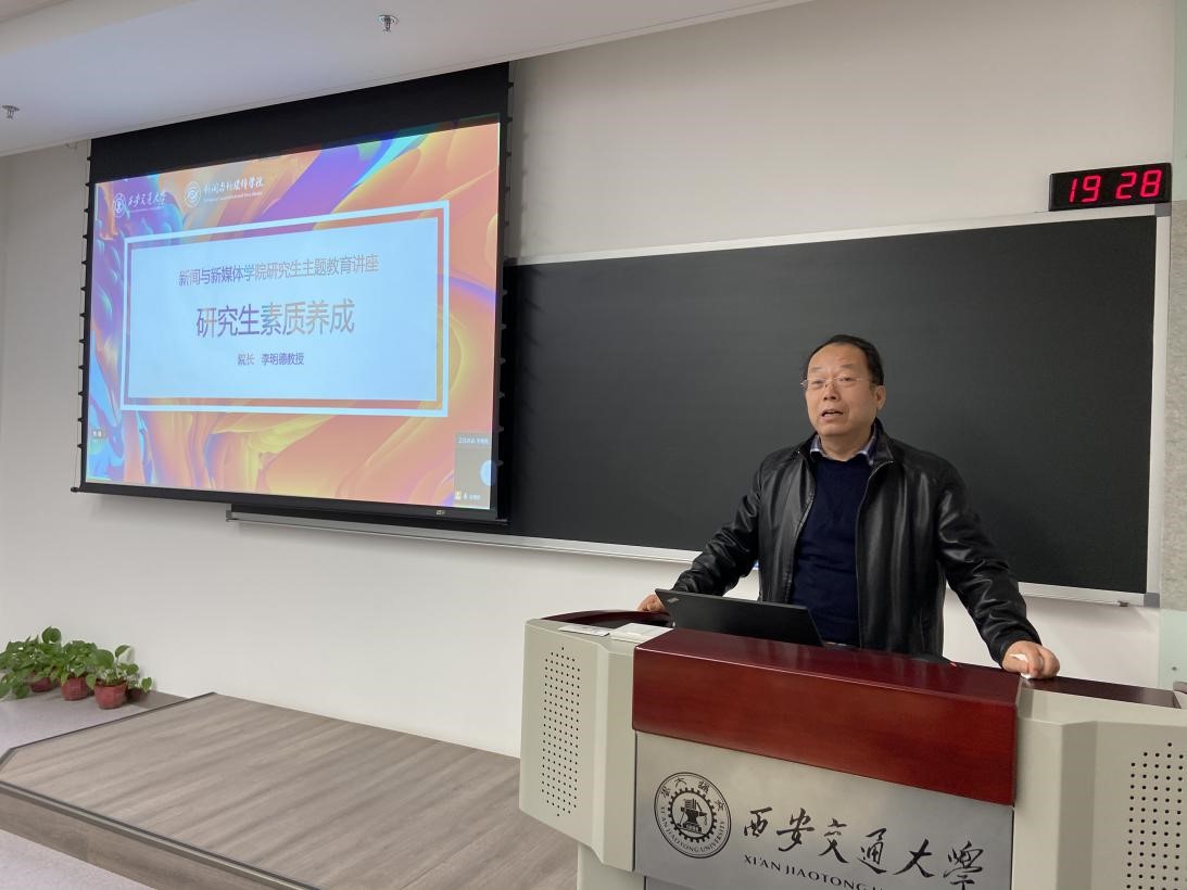 李明德院长在会上做了题为《研究生素质养成》的主题教育讲座,讲座围绕研究生为什么要做科研、研究生与导师的关系、研究生综合素质提升三方面展开。对于研究生为什么要做科研这个问题,李明德院长认为研究是研究生教育的核心,研究生经过小学中学大学阶段的学习积累有了一定的知识积淀,到研究生阶段要有研究问题的自觉,带着批判性地眼光不断地提出问题、思考问题、解决问题。双一流大学、研究型大学的学校定位决定研究型或者应用研究型人才是我们学院的培养方向,很难想象一个研究生只能做应用型的实际工作,而不能用文字记录表述分析总结提升所从事的工作。
