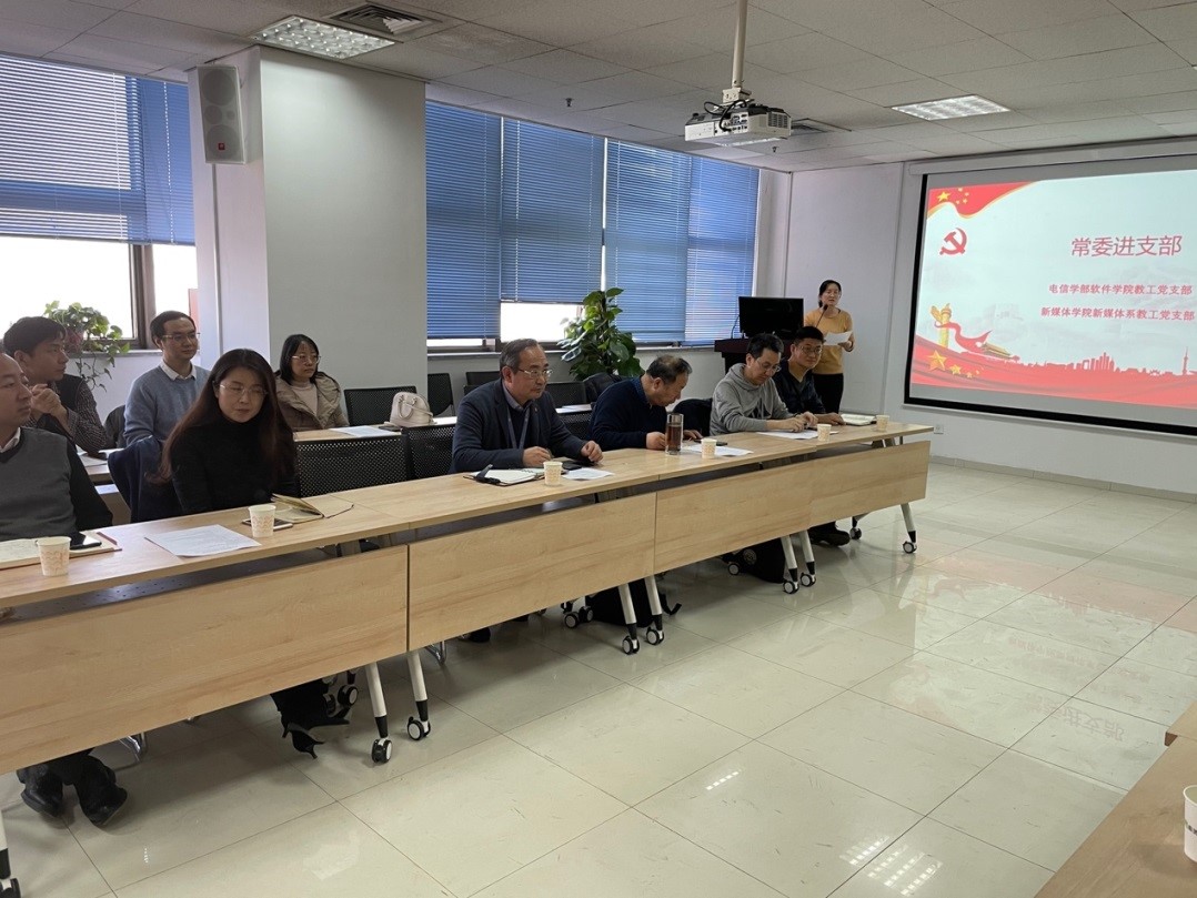 院长记李明德、党总支副书记韩博、副院长张宏邦、副院长孙鹤立、新媒体系主任马晓悦;电信学部党委书记梁莉、软件学院院长龚怡宏、党总支书记朱利、副院长祝继华以及新媒体系党支部、软件学院党支部党员参加了会议。校党委常委、党委宣传部部长成进出席会议并指导工作。