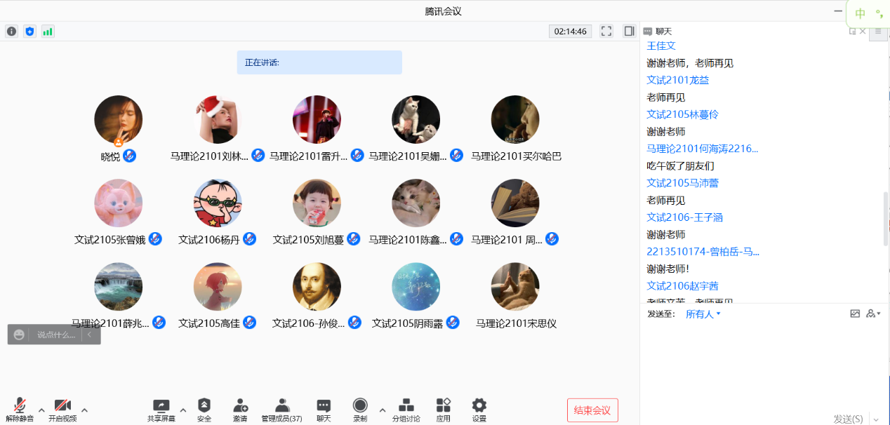 新媒体系系主任马晓悦老师承担的本科课程人数达100多人,数量多,任务重,好在有去年的经验,经过学院教务老师统一通知,全部学生都整整齐齐按时出现在授课平台上,上课过程中学生们积极主动配合,乐观面对,屏幕上一句句“辛苦了”让马老师倍感欣慰。她相信这帮大一的孩子会在这次防疫中得到成长,变得更加处事不惊,正好结合《传播与社会热点问题透视》这门课的教学内容,真正做到网络清空的捍卫者。