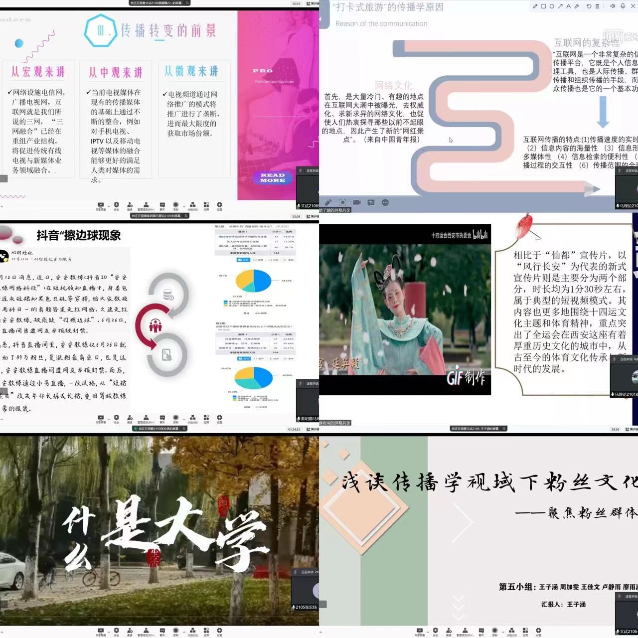 40余组的汇报展示展现出学生认真、精细的求学态度,整体呈现出了较高的选题、执行、展示能力,其中不乏精彩亮点。比如:有小组尝试探讨党史宣传、百年中共宣传能否尝试与流行词、网络热梗相结合,增强党史宣传的趣味性,提升党史宣传在青年一代的传播力;有小组探究新媒体时代时政类谣言的产生与治理,深探辟谣难题与舆情应对;更有小组从日常生活出发,关注交大校园,从传播学的角度试图解决七彩阁生活问题,为宿舍建设出谋划策;策划交大姻缘社,依不同书院学生专业构成设计不同风格的海报,创意满满......从线下转移到到线上,汇报平台的改变丝毫不影响同学们稳定高质量的发挥,最终为这门课交上满意的答卷。