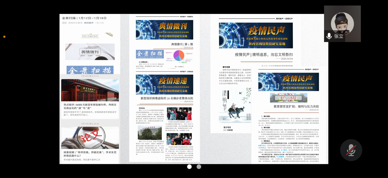 自2015年以来的智库建设工作作了梳理与总结。她表示,舆情研究成果现已有效服务于学院教学和科研,在专著出版、国社科基金项目和教育部课题争取、高质量论文发表(《新华文摘》全文转载)、省级一流课程获批、人才培训和社会服务等方面大有助益。围绕新媒体与社会治理、体现“工字牌”内涵建设、实现了传统媒体与新媒体的融合并实现线上线下互动的立体式运行发展、成为中省党政部门重要的决策支持,是她对智库特色功能的总结。
