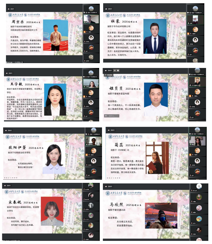 此次座谈会以线上形式举行,邀请到了知名校友、西安博达软件股份有限公司董事长魏小立先生,知名校友、美林数据技术股份有限公司董事长程宏亮先生,以及优秀毕业生周京乐、杜蒙、王学敏、姬贝贝、宋春妮、马欣然、欧阳伊萱、蔺蕊等8名校友。黑料网