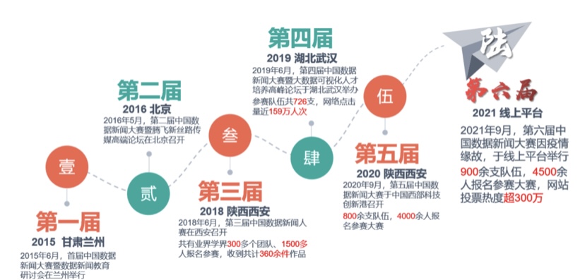 中国数据新闻大赛设立于2015年,至今已成功举办六届,作为国内新闻传播学界和业界广泛认可的赛事品牌,中国数据新闻大赛规模和影响力正逐年扩大,吸引了来自北京大学、清华大学、南加利福尼亚大学、莫斯科大学等220余所国内外高校,以及中国国际电视台、新华网等数十家媒体机构的一千余支队伍参赛,人民日报、中央广播电视总台等上百家媒体报道,选题涉及社会、经济、文化、教育等各个领域。该赛事已成为国内唯一一项持续举办的,具有较大影响力的全国性融媒体作品创作与人才培养比赛。