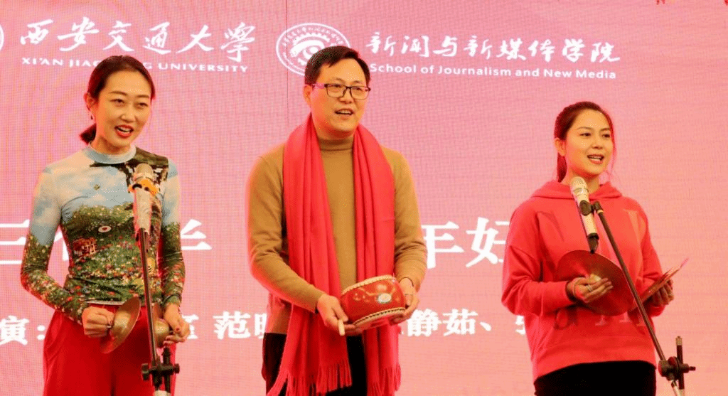 随后是学院办公室范晓莹、王静茹、张收鹏老师带来的传统节目三句半《新年好》,他们以风趣幽默的方式向学院全体教职工送上了新年祝福和美好期盼,惹得台下众人发出阵阵笑声和热烈掌声。