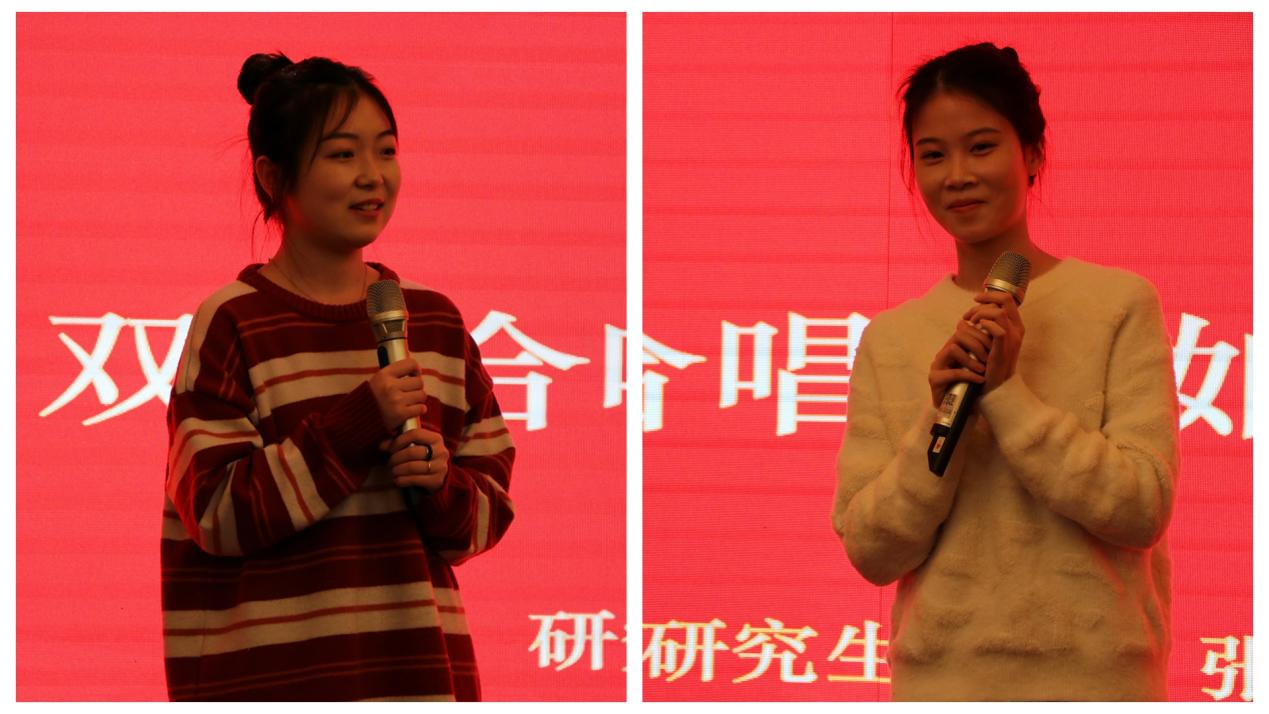 一段安静柔和的茶艺表演结束,大家的目光又被研究生杨颖和张婉柔带来的双人合唱《如愿》所吸引。一首《如愿》,歌词朗朗上口,娓娓道来,层层堆叠,最后喷薄爆发,将电影《我和我的父辈》传递的亲情与家国情唱进了无数中国人的内心,也唱出了两位同学对学院各位老师和同学们新一年最美好的祝愿。