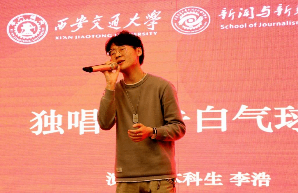 紧接着,本科生李浩同学带来了一首青春洋溢的《告白气球》,展现了同学们积极开朗的精神风貌。