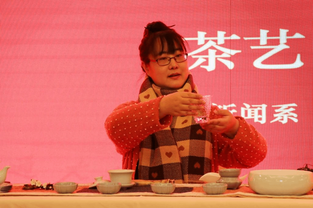 经过一轮富有悬念的抽奖环节,随之而来的是新闻系申楠老师带来的茶艺表演。伴随着一段古朴典雅、纯净飘逸的古筝曲,她轻轻拿起茶杯向大家展示,优雅端庄的举动中体现着我国古老茶文化的无限魅力。