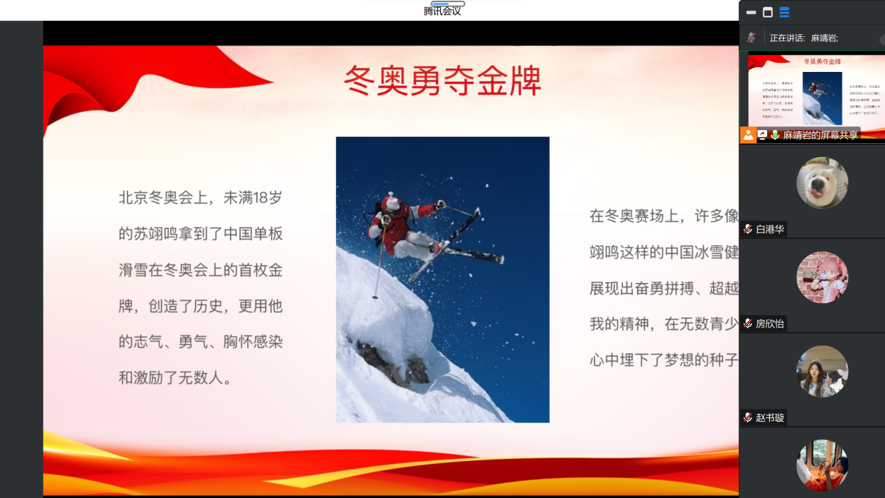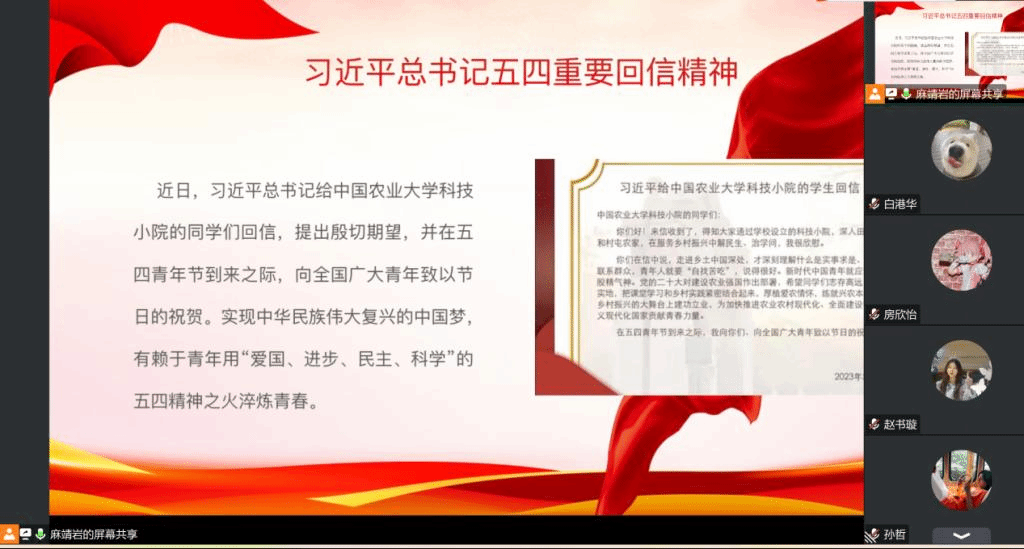 习近平总书记五四重要回信在各级共青团组织中引发了热烈反响,极大鼓舞和振奋了全国广大青年和青年工作者,为了纪念和发扬“五四”的革命精神与光荣传统,学习习近平总书记重要回信精神,5月28日晚,硕1193党支部召开以“传承五四精神,谱写奋斗青春”为主题的5月党团联合线上组织生活会,在会议学习过程中同学们对于自己作为新时代交大青年传承五四精神的责任感和使命感有了更深刻的认识和理解。硕1193班团支书麻靖岩主持此次会议。