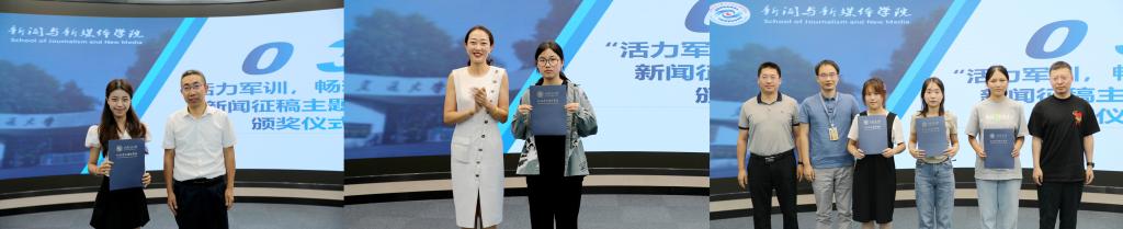 学院领导为“活力军训,畅想未来”新闻征稿主题活动的获奖同学颁奖,此次征稿活动收到来自新生同学关于专业认知、军训教育、文体生活等各方面的作品,评选一等奖1项,二等奖1项,三等奖3项。