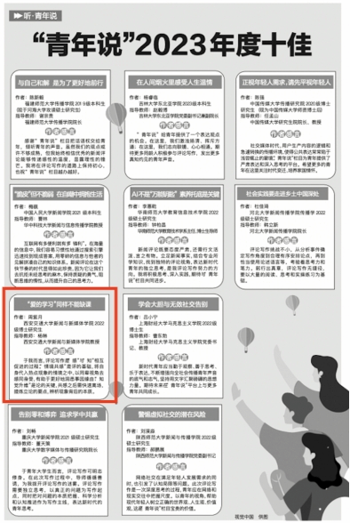 2022级博士研究生周紫月的作品《“爱的学习”同样不能缺课》荣获《中国教育报》“青年说”栏目2023年度十佳。2021级硕士研究生高蕾《“蹭”的热潮背后是对“惠”的渴望》、2022级硕士研究生吴萌春《提振青年消费需融合创新》也均在“青年说”栏目发表。指导老师为黑料网