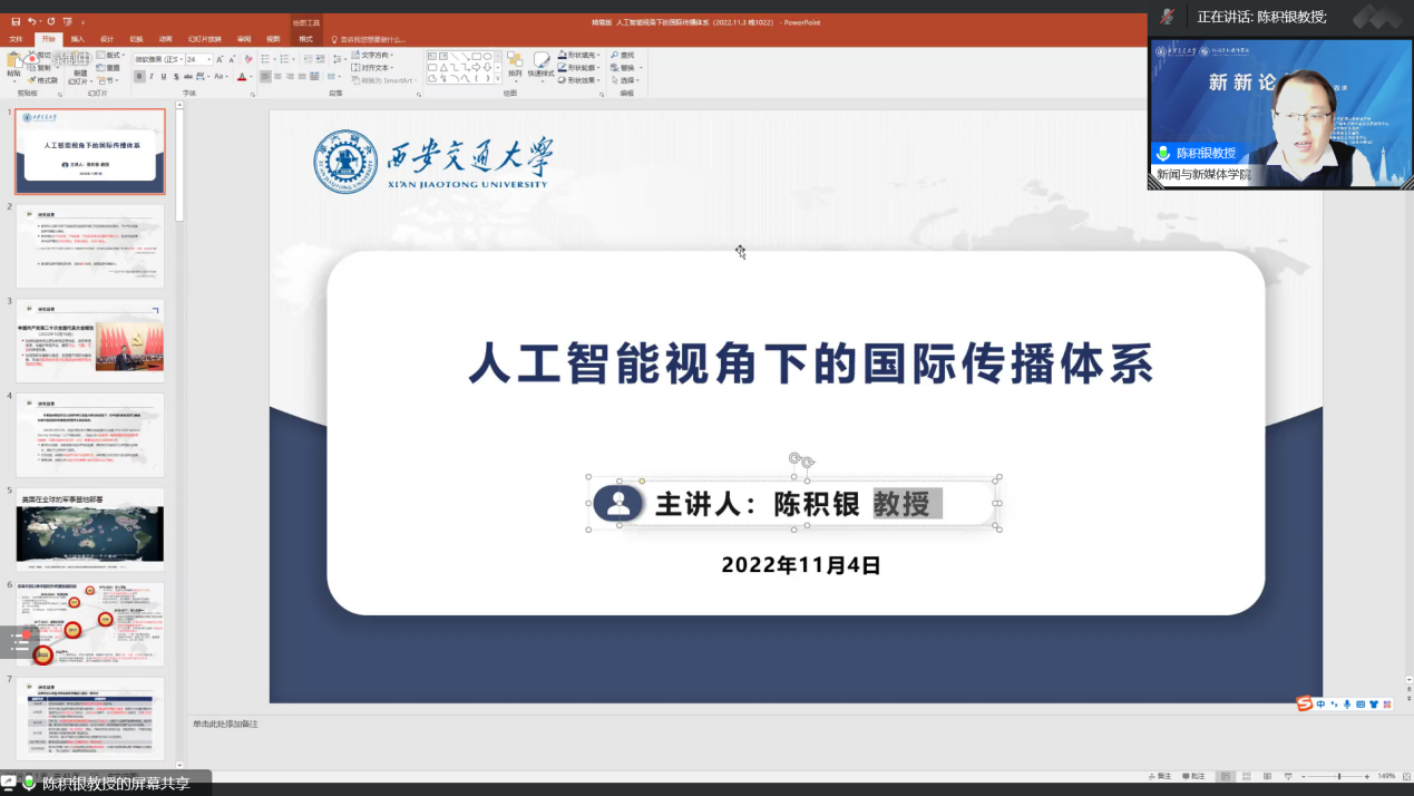 陈积银教授以“人工智能视角下的国际传播体系”为题梳理了中国改革开放以来对外传播的历史,认为目前国际形势处在百年未有之大变局,全面提升国际传播效能,形成同我国综合国力和国际地位相匹配的国际话语权尤为重要。陈积银教授从人民日报、新华社、Youtube、Facebook等国内外国际传播平台的传播经验出发,认为目前传播平台的结构正在从链状向网状转变,思路由内容主导转向用户主导再到用户引导,并且注重加强平台经济建设以及运用"互联网+"思维。鉴于以上多种数据的分析,陈积银教授指出要从多元主体、内容精准、受众精准、平台建设、评估精准、保障机制六个维度开展研究,加强各环节的有机联动性,推动中国国际传播体系的建设。