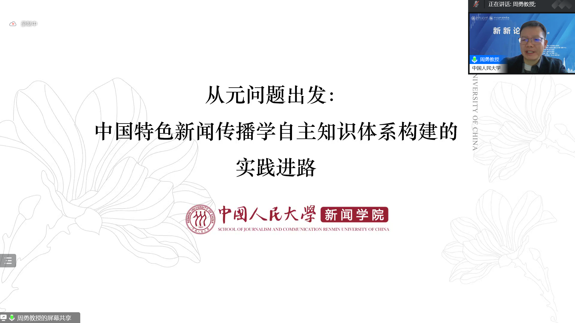 周勇教授以“元问题、基本面向与焦点领域:中国特色新闻传播学知识体系的建构逻辑与实践进路”为题,从历史维度出发,回顾了过往新闻传播学科的知识图谱,指出目前新闻学研究的客体已经从技术、制度、文本等领域扩展到整个新闻实践过程中,而新闻传播学的研究本体从侧重工业化生产的大众传播逐渐转向成“体系”的信息传播,由此带来了新闻传播学体系元问题的两个维度:对内要解决信息传播体系的自身建设问题,对外要聚焦该体系及其实践活动外部影响。