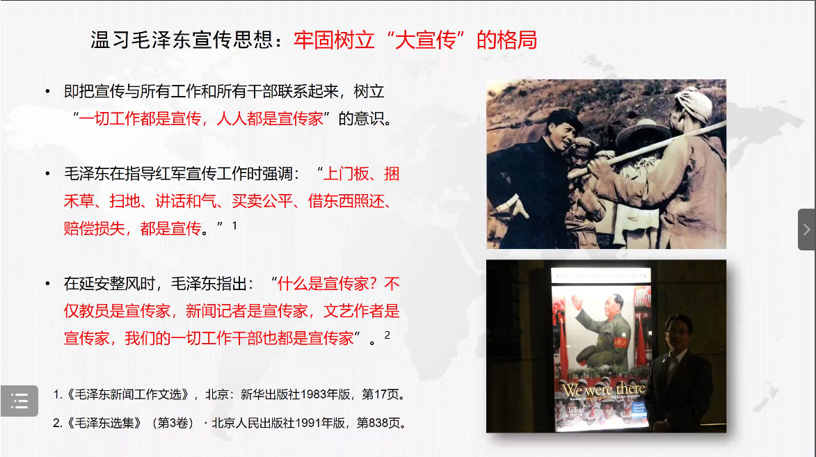 陈教授建议同学们要温习毛泽东的宣传思想,牢固树立“大宣传”格局,树立“一切工作都是宣传,人人都是宣传家”的宣传意识,宣传作风要接地气,鼓励同学多读原文、多学原理,温故而知新。