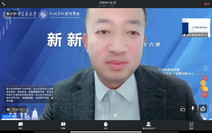 吴晔教授在题为“当传播学遇到数据”的讲座中,首先介绍了计算传播学的概念,计算传播学是建立在丰富的人类传播行为的数据之上的,收集和分析这些传播行为数据就成了计算传播学的主要工作,计算传播学的主旨是基于计算社会科学,为传播学构建一个整个信息传播过程可计算的框架。“数据”与“计算”是计算传播学的要义,计算传播学也已经成为了新文科的一个重要实现途径。其次,吴晔教授区分了传统传播学与计算传播学在的概念、研究框架等方面的不同,并利用公众注意力调查、绘制知识版图、新主流媒体短视频人格化传播、中国官方媒体全球文化传播网络四个生动具体的案例,来体现计算传播学在总结历史、描述现在、预测未来和改变命运四方面的重要作用与影响。最后吴晔教授就计算传播科研团队人员构成与结构,以及传播热点如何保持持久性和新颖性等问题展开了讨论。