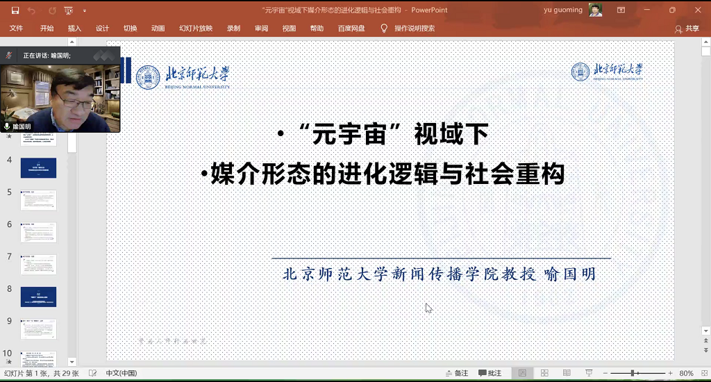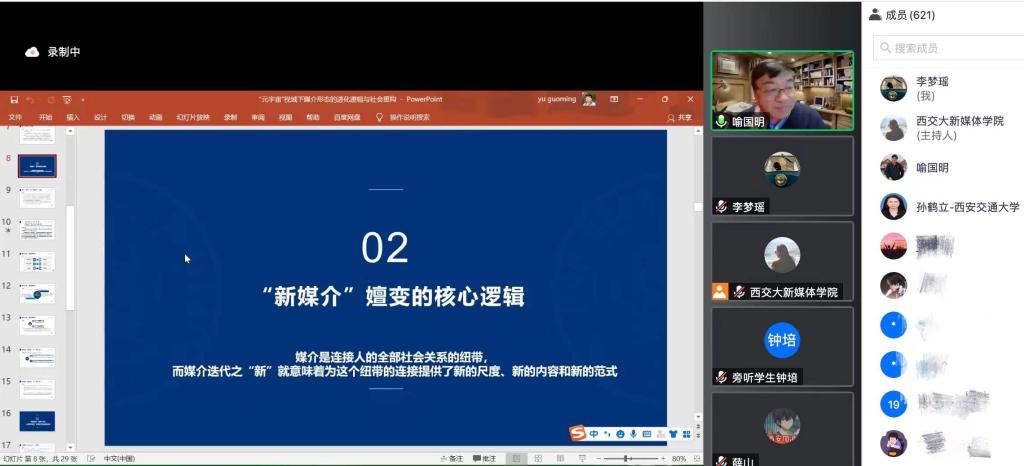 1月19日,北京师范大学新闻传播学院学术委员会主任喻国明教授带来“元宇宙”视域下媒介形态的进化逻辑与社会重构主题讲座,探讨元宇宙对传播与社会的深刻解构所带来的一系列改变,以及对于传播学学科重构的关键性影响,来自西安交大及其他高校、科研院所、媒体等600余名师生及从业者在线参加学术报告会。本次讲座由孙鹤立副院长主持。