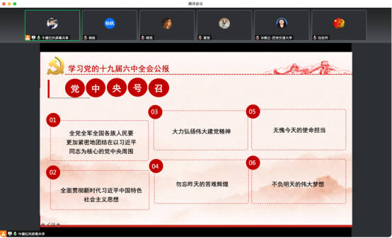 最后,牛耀红强调,“以史为鉴可知兴衰”,党的十九届六中全会指出两个重要问题:一是看清过去,我们为什么会成功;二是着眼未来,我们怎样继续成功。面对中国共产党第二个百年目标,我们每一位党员都要有责任意识和担当意识,承担起中华民族伟大复兴的历史使命。同时,我们还要发扬实干精神,脚踏实地,砥砺前行。作为一名新闻传播学教师,面对科学技术新发展,我们要以饱满热情迎接挑战。大处着眼,小处着手,把学术论文写在祖国大地上,把研究做在人民最需要的地方,以自己所学专长为党和国家贡献自己的智慧。