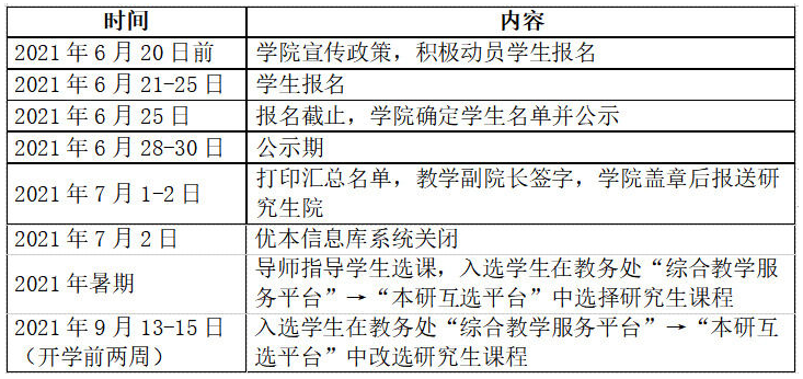 (三)学生报名。学院自行组织学生报名。研究生教学秘书将报名学生信息录入2021年“优本信息库”(操作方法见附件1:“优本计划信息库操作指南”)。