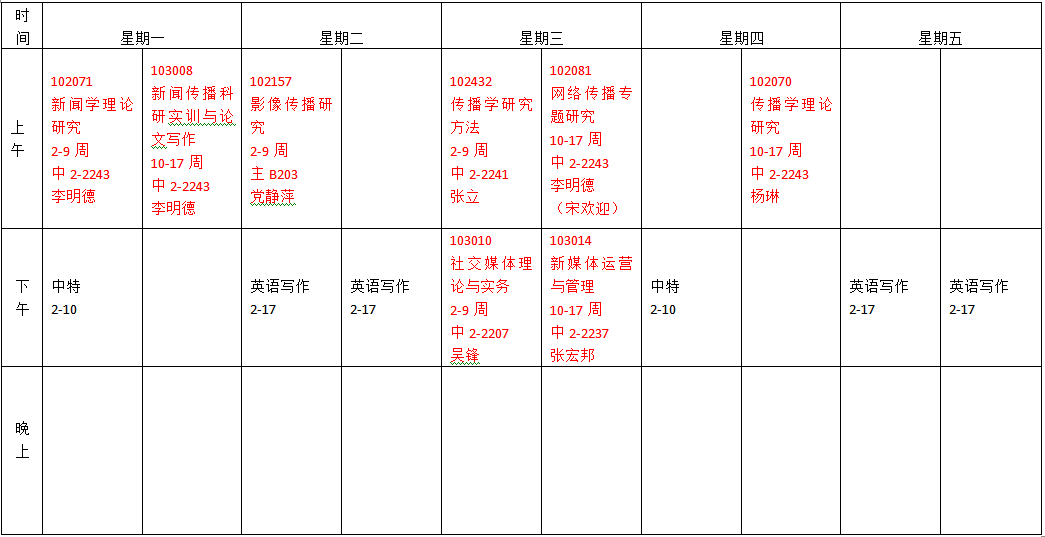 新闻传播学专业硕士研究生 2017-2018学年第一学期课表