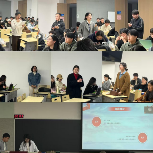 &计算机学院联队)则认为AI压缩重复性工作时间为人类腾出更多创造性空间。双方在“技术工具属性与主体性侵蚀”“AI时代的专利发明对比”等维度展开四轮激烈的交锋,最终正方以“更具现实警示价值”的论点胜出。实际上,两个观点并无对错之分,这场文理思维的碰撞,本身就是对抗技术异化的创造力实践。