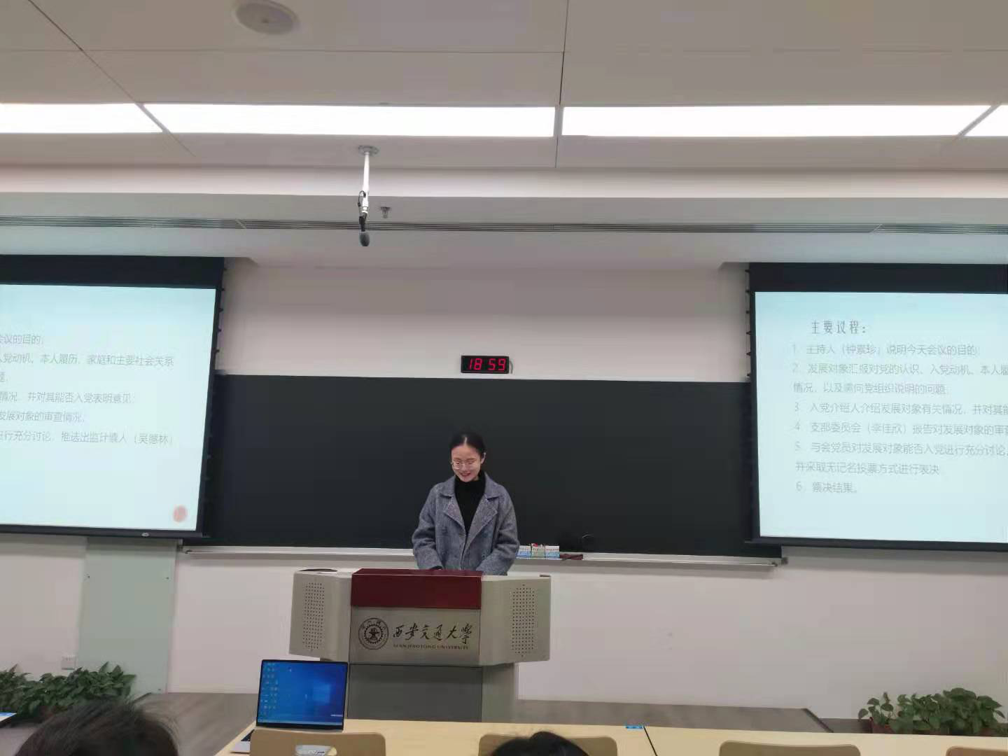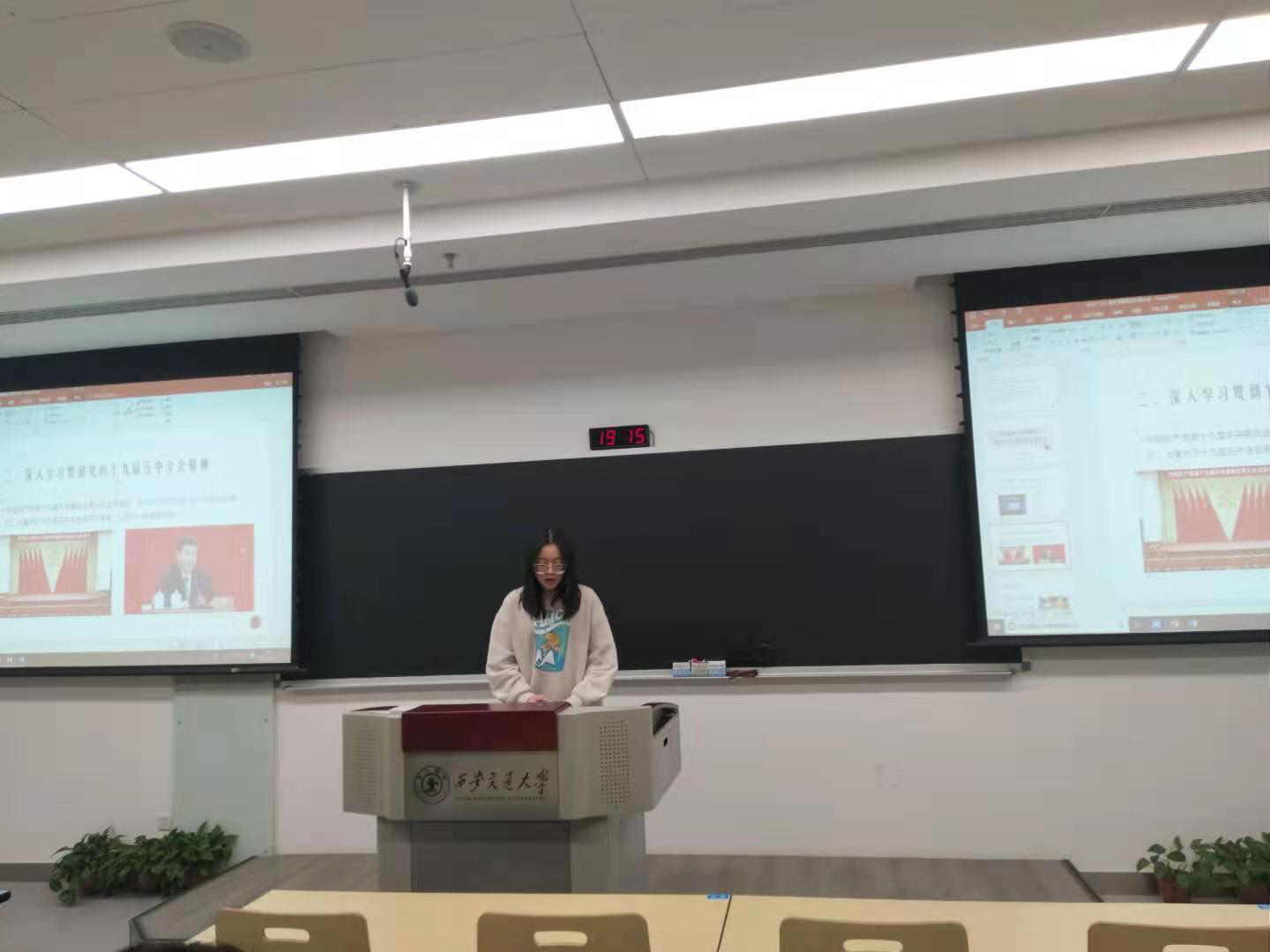 研究生教育会议精神。会议以“新时代、新平台、新模式、新贡献”为题,旨在深入学习贯彻习近平总书记关于研究生教育工作的重要指示、党的十九届五中全会和中央经济工作会议精神,全面落实全国研究生教育会议精神,进一步推进研究生教育改革,落实立德树人根本任务。钟素珍表示,作为一名西交学子,我们更应明晰自身定位,肩负使命,守正创新,为民族复兴贡献力量。随后,党支部副书记李佳欣带领全体党员、预备党员及入党积极分子深入学习贯彻党的十九届五中全会精神。李佳欣为大家解析会议事项、解读《中共中央关于制定国民经济和社会发展第十四个五年规划和二〇三五年远景目标的建议》。会议指出,习近平总书记在全会上的重要讲话,审时度势、总揽全局、思想深邃、内涵丰富,科学回答了一系列重大理论和实践问题,为全面建设社会主义现代化国家指明了前进方向、提供了行动指南。