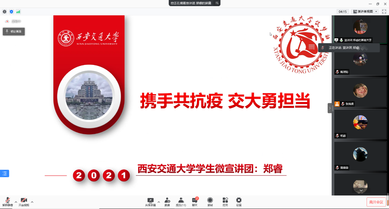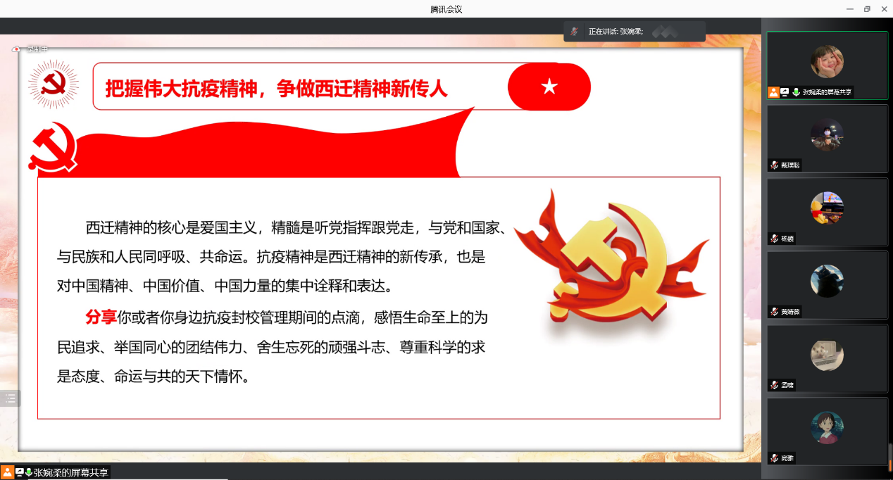 微宣讲团的郑睿同学,以“携手共抗疫,交大勇担当”为主要内容,郑睿同学结合西迁精神展开了声情并茂的主题演讲。支部成员依次分享交流抗疫过程中所见所学,采用线上的方式,召开了这场特殊的组织生活会。