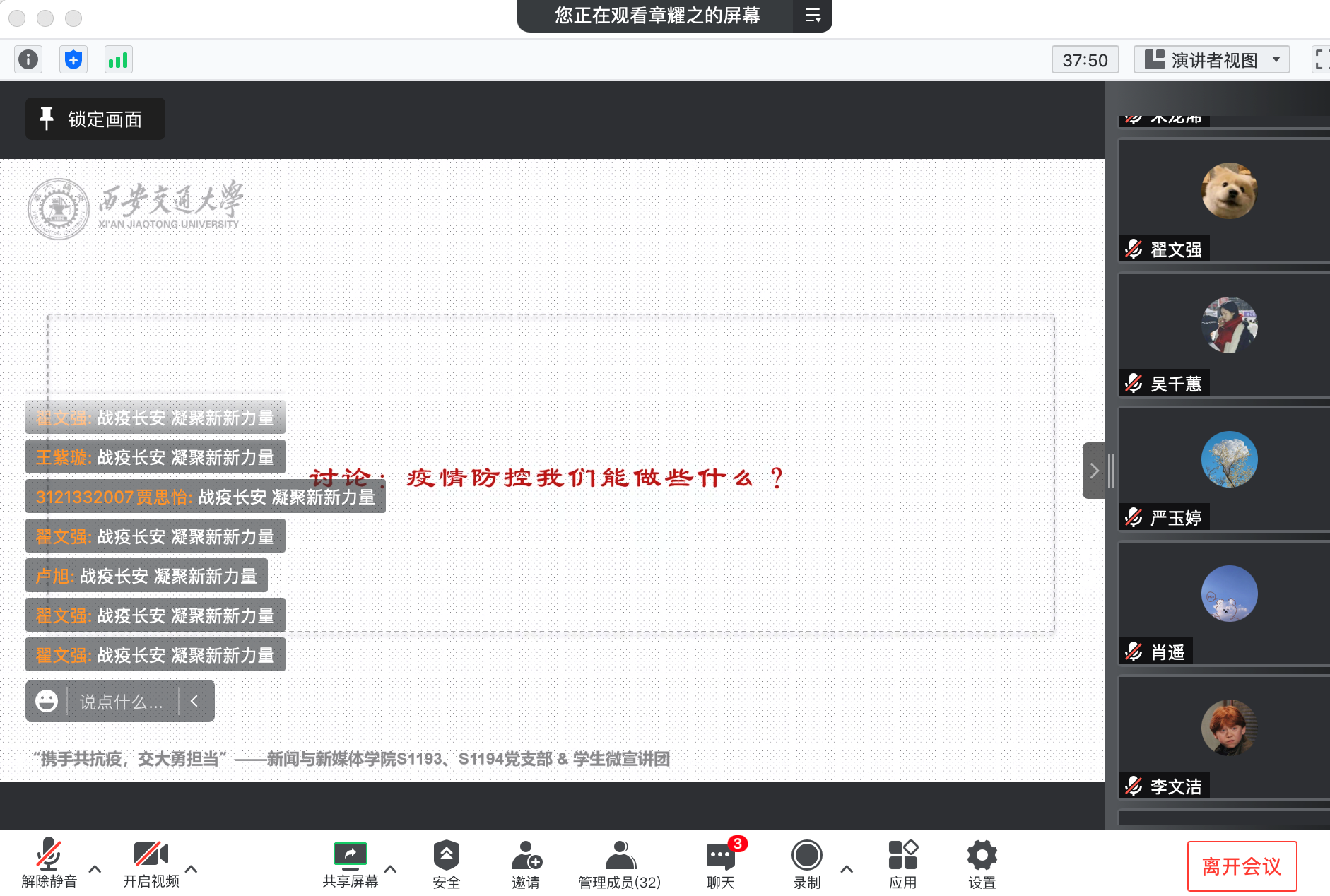 听完志愿者的分享后,硕1193党支部书记孙哲同志鼓励大家在后续的抗疫先锋队工作中,能够积极加入组织,以自身行动与毅力协助医护工作人员共同抗击疫情,为疫情防控贡献自己的一份力量,展现新闻与新媒体学子的凝聚力以及攻克疫情的决心与毅力。硕1194党支部书记章耀之同志也动员大家能够积极将学科优势和疫情防控结合起来,可以参与剪辑抗疫宣传视频、创作抗疫宣传新闻稿件等工作。在组织生活会最后,参与会议的硕1193、1194党支部成员共同在屏幕上表明了对于抗击疫情的决心:“战疫长安,凝聚新新力量”。
