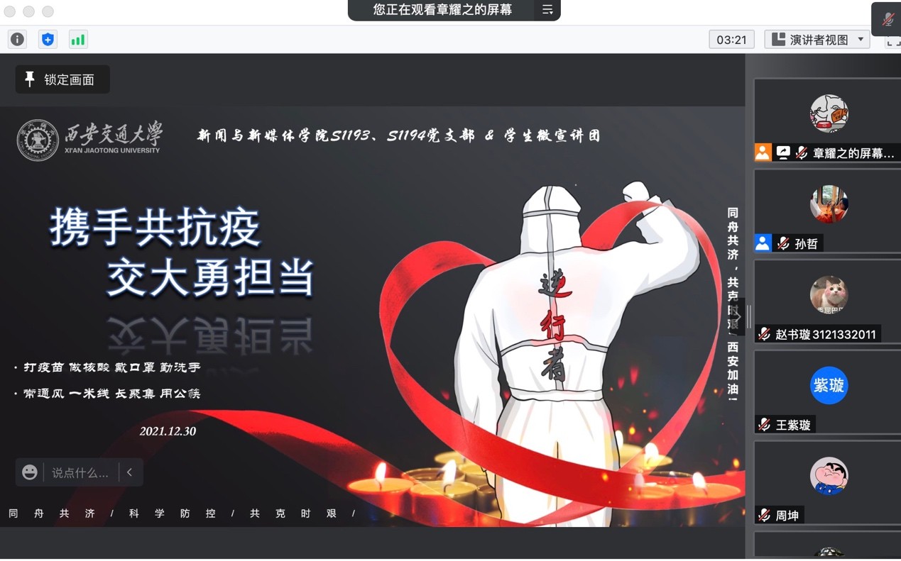 硕1194党支部书记章耀之同志首先以西安市整体疫情情况引入,向大家介绍了当前严峻的防疫形势,提醒大家对于个人的防护工作不能掉以轻心,同时也要积极配合政府和学校的安排,保持心情愉悦,避免过度恐慌。随后黑料网