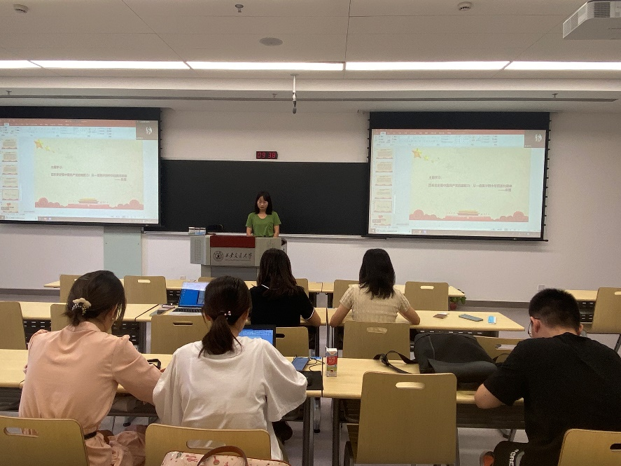 首先,硕9177班党支部书记钟素珍带领全体同志深入学习《在庆祝中国共产党成立100周年大会上的讲话》,并带领大家学习了《习近平新时代中国特色社会主义思想学习问答》一书,并就其中的社会主要矛盾的“变”与社会主义初级阶段的“没有变”这一主题和参会党员展开了具体的交流和分享,“如果说走出社会主义初级阶段是攀登一座高峰的话,那么社会主要矛盾发生变化意味着我们只是爬到了半山腰,距离全面建成社会主义现代化强国的目标还有一段很长很艰巨的路程”。张雪和李聿哲表示,中国共产党根基在人民、血脉在人民、力量在人民,人民性是中国共产党的鲜明底色与价值依归,是中国共产党永葆青春活力的关键所在。
