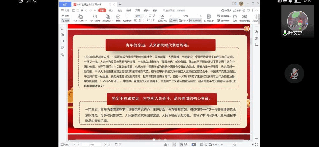 会议伊始,叶文杰同志带领大家展开重要讲话精神的学习。他以新民主主义革命时期、社会主义革命和建设时期、改革开放和社会主义现代化建设新时期、中国特色社会主义新时代四个时期为时间线索,阐述了青年命运与时代的紧密联系,“共青团的初心使命是坚定不移跟党走,为党和人民奋斗。”