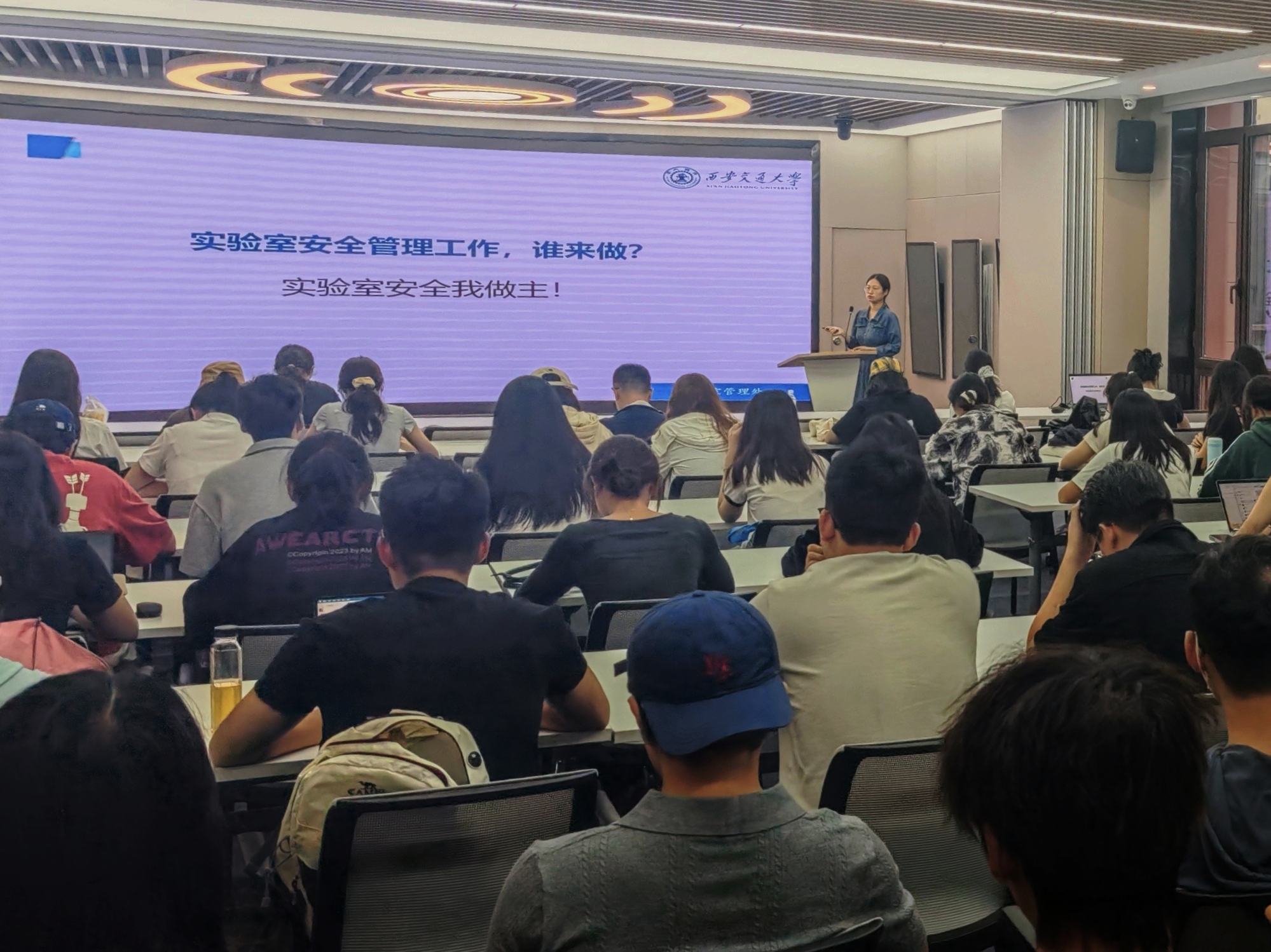 召开2025级研究生新生实验室安全教育培训会,旨在落实学校实验室安全教育和准入工作相关要求,切实保障实验室的操作安全与科研活动的顺利开展。本次培训会特别邀请到学校实验室管理处兰云飞老师作为主讲嘉宾,学院全体研究生新生参会。会议由院实践教学发展中心张宇朔老师主持。