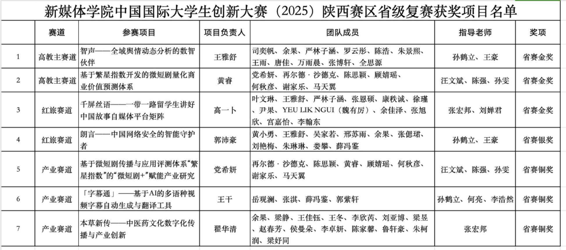 近日,中国国际大学生创新大赛(2025)陕西赛区省级复赛获奖名单公布,我院参赛师生共获金奖3项、银奖1项、铜奖3项,覆盖高教主赛道、红旅赛道和产业赛道。其中,《智声——全域舆情动态分析的数智伙伴》和《繁星指数——基于繁星指数开发的微短剧量化商业价值预测体系》2个项目斩获高教主赛道金奖,《千屏丝语——一带一路留学生讲好中国故事自媒体平台矩阵》项目斩获红旅赛道金奖。