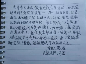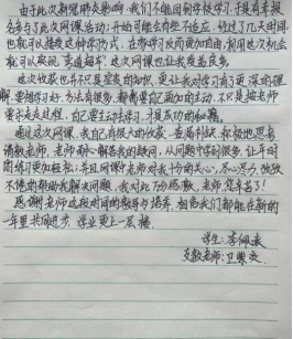 在支教结束之际,很多学生都通过手写信的形式表达感激之情,虽字迹稚嫩,但却饱含深情。学生王凤娟在对志愿者马蕾的信中写道:“之前我都不怎么敢开口讲英语,这些天在老师的带领下逐渐放开,之前在学校没听懂的地方和不会做的题型,老师都有针对性地讲,给了我很大帮助!”